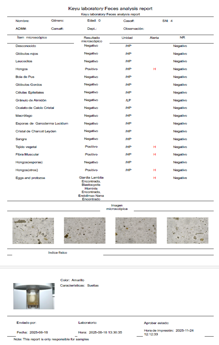 - Reportes con imágenes y téxtos. El resultado incluye índices físicos, elementos microscópicos y parámetros de los inmunoensayos.